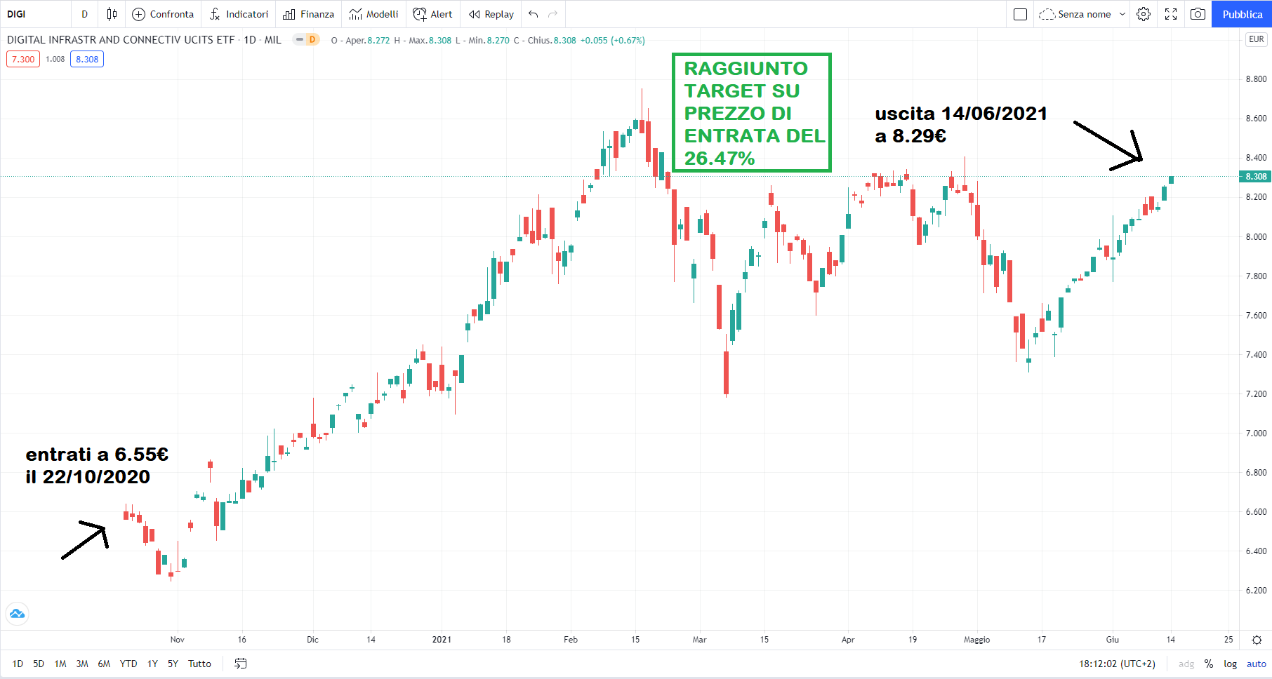 Non è stata quindi una cattiva mossa entrare in posizione su questo ETF all’inizio della sua quotazione sui mercati il 22/10/2020. Siamo entrati al prezzo di 6.555€ e siamo usciti ieri al prezzo di 8.29€, andando a target e guadagnando sul prezzo di entrata ben il 26.47%.