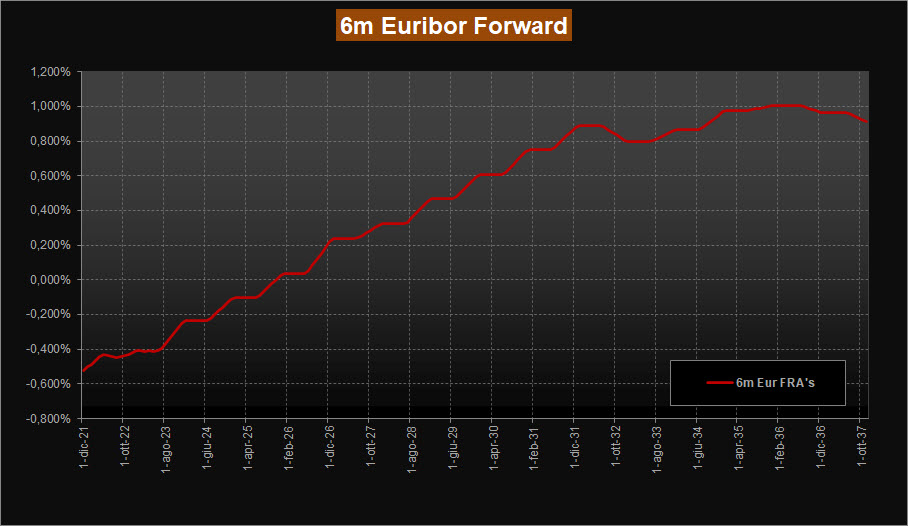 La lettura della ZC-Yield Curve mostra una contrazione dei rendimenti sia sul tratto a medio sia sul tratto a lunga rispetto alla scorsa analisi. Il rendimento della scadenza a 10 anni scende un po’ e si porta allo 0,12% mentre la scadenza trentennale amplifica un po’ il movimento assestandosi poco sotto lo 0,50% rispetto allo 0,55% del mese scorso e allo 0,56% del mese di aprile. Stabile, come da tempo a questa parte, la forma della curva, con la parte a breve e medio inclinata positivamente a circa 45° per poi appiattirsi completamente sulle scadenze lunghe. La curva evidenzia per ora un massimo di rendimento sulle scadenze 2044-2046, in contrazione rispetto alla scorsa rilevazione e ora in area 0,52% rispetto allo 0,56% del mese scorso. Più stabili invece i tassi forward su Euribor 6 mesi, con il tratto a medio che si mantiene inclinato positivamente con conferma di previsione di tassi positivi entro il 2025, e con il tratto a lunga che rimane a contatto con area 1,00%. Il tratto a breve è sempre compreso nell’intervallo -0,50%/-0,40%.