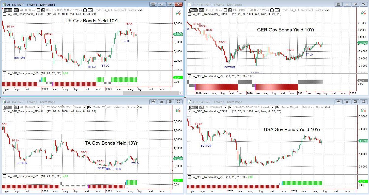 Osservando – a livello di analisi integrata – le curve dei rendimenti dei principali benchmark decennali, il quadro non mostra particolari variazioni, salvo alcuni movimenti di aggiustamento sempre però inseriti nel contesto dei cambiamenti strutturali avvenuti sui mercati obbligazionari a partire dai primi mesi del 2021. Sull’area UK si è formato un trading range nei pressi dei massimi di periodo, tra area 0,90% e area 0,70% di rendimento, con Trendycator sempre LONG. Dinamica più o meno simile, anche se più direzionale il BUND, che dopo aver toccato il massimo rendimento di periodo in area -0,07% ha corretto pesantemente sino a -0,30% per poi rimbalzare e assestarsi al rendimento di -0,15%; modello Trendycator ancora in stato NEUTRAL. Anche il nostro Btp ha sviluppato un movimento dello stesso tipo, con una correzione verso lo 0,70% di rendimento dopo l’accelerazione delle scorse settimane sino all’1%; ora siamo nei pressi di area 0,90% e con Trendycator ormai stabile sul LONG. Rendimenti dell’area USA in assestamento, anche se graficamente si sta delineando uno scenario moderatamente ribassista. Il decennale statunitense è ora intorno all’1,50% di rendimento, livello recuperato dopo aver testato un affondo sotto area 1,40% e presenta un Trendycator saldamente LONG.