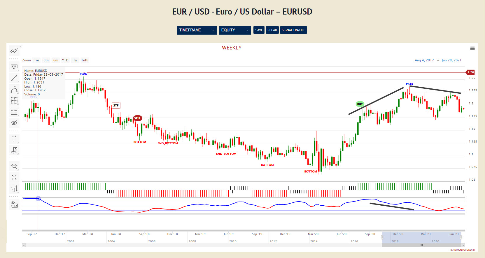 Infatti, la divergenza negativa generata nel periodo settembre 2020 – dicembre 2020 ha portato ad un primo impulso ribassista a inizio 2021 da cui è scaturita la reazione che ha temporaneamente messo in dubbio il quadro potenzialmente favorevole alla valuta USA. Ma il Trendycator è sempre rimasto NEUTRAL, senza farsi scomporre dal rimbalzo sin sopra 1,22 e, a ben guardare, i prezzi stanno disegnando massimi decrescenti dal picco di inizio 2021.