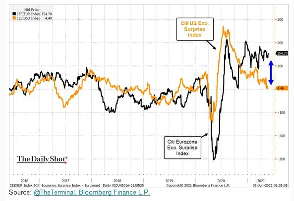 Il secondo grafico è il Citigroup Economic Surprise Index, un indicatore che misura lo scarto tra le attese dei mercati e la realtà. Per essere più precisi, ogni giorno l'indice misura la deviazione standard tra i dati macroeconomici e il consenso medio degli operatori (Bloomberg survey median). Quando il grafico dell'indice sale verso l'alto, significa che i dati macro hanno battuto il consensus degli operatori; viceversa, quando l'indice scende i dati economici hanno deluso.