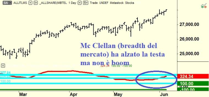 Il breadth di mercato sull’azionario Italia misurato dal Mc Clellan è in zona neutra e ci piacerebbe vederlo a livelli più euforici per un breakout di questa portata
