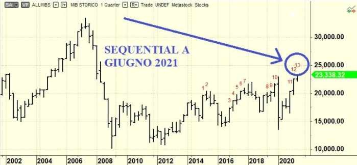 2. A livello di analisi ciclica il nostro indice MIB storico mostra un terrificante Sequential sul grafico trimestrale mentre ha sforato da qualche settimana un Sequential sul grafico settimanale. Insomma per il Sequential siamo a fine corsa. Dobbiamo però sempre ricordare che il Sequential si legge in un verso o nell’altro, cioè il Sequential ti dice che il ciclo è finito e sta per succedere qualcosa ma non ti dice da che parte girerà il mercato.
