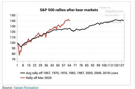 1. L’ottimismo è ai massimi storici per le azioni e posto due grafici che la dicono lunga: il primo è l’andamento storico medio degli ultimi recenti rally dell’SP500 (linea nera) raffrontati a quello odierno (linea rossa). Come vedete siamo davanti ad una fase estiva di ritracciamento: