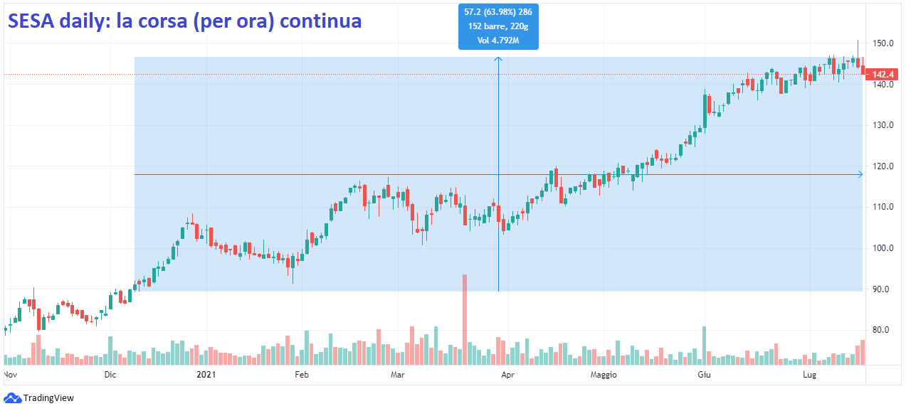 SeSa resta quindi un titolo interessante per il settore di appartenenza (Intermonte ha inserito SeSa tra 14 azioni a media e bassa capitalizzazione destinate a beneficiare delle opportunità del mercato digitale italiano post-pandemia, alimentate dal piano di investimenti pubblici appena approvato dal Consiglio dei ministri dell'Economia e delle finanze dell’Ue) e per gli ottimi dati fondamentali, ma da prendere in considerazione con estrema cautela.