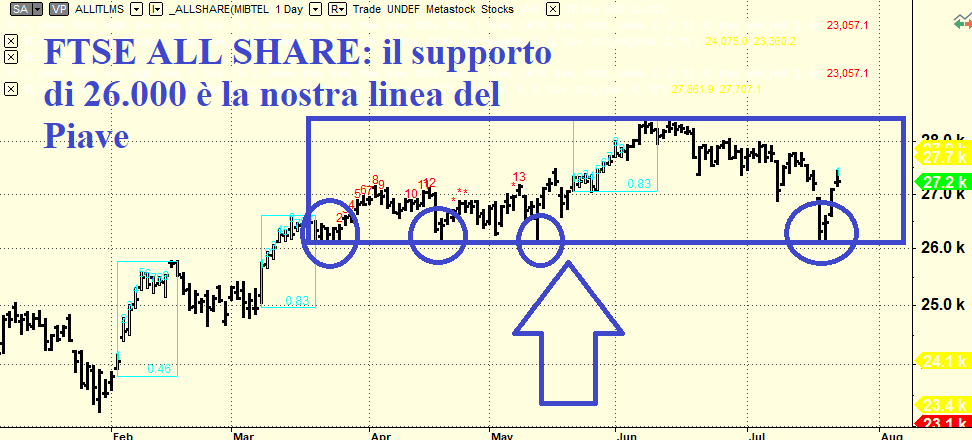 Diciamo subito che il rialzo è salvo. Come dimostra il grafico che segue abbiamo un forte supporto a quota 26.000 toccato ben 4 volte. Oggi i prezzi hanno toccato la linea di tendenza di breve descrescente e penso che davanti possiamo avere solo la congestione fatta di mini crolli e rimbalzoni. E questo almeno fino a settembre.
