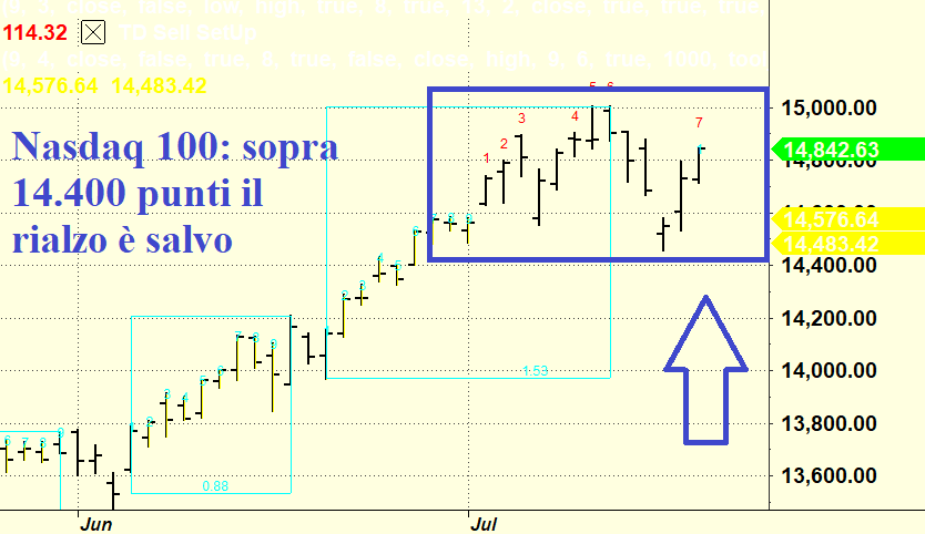 Se guardiamo il Nasdaq 100 notiamo che abbiamo un triangolo orizzontale in formazione e quindi ne avremo ancora per diverse settimane prima della decisione finale. In fin dei conti siamo ad agosto ormai no ? E quindi è bello anche vedere il mondo tornare normale.