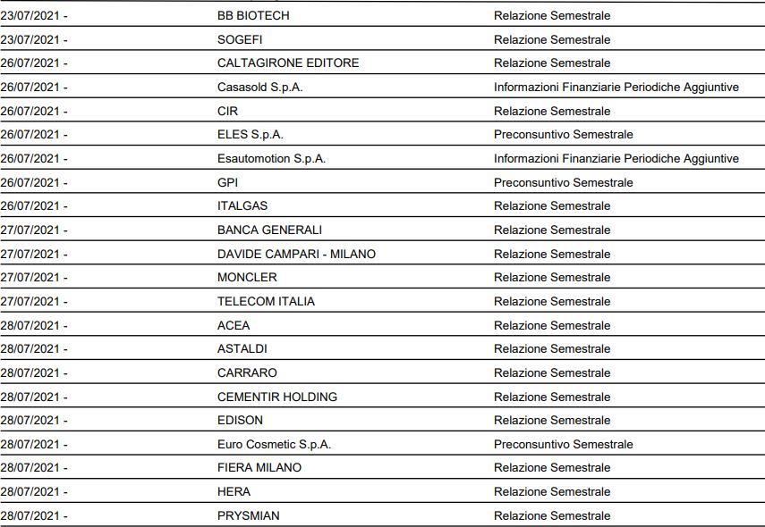 Di seguito riporto il calendario delle società che pubblicheranno la relazione semestrale