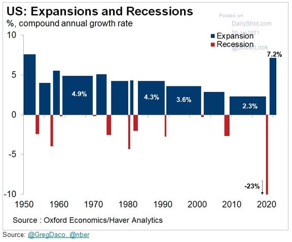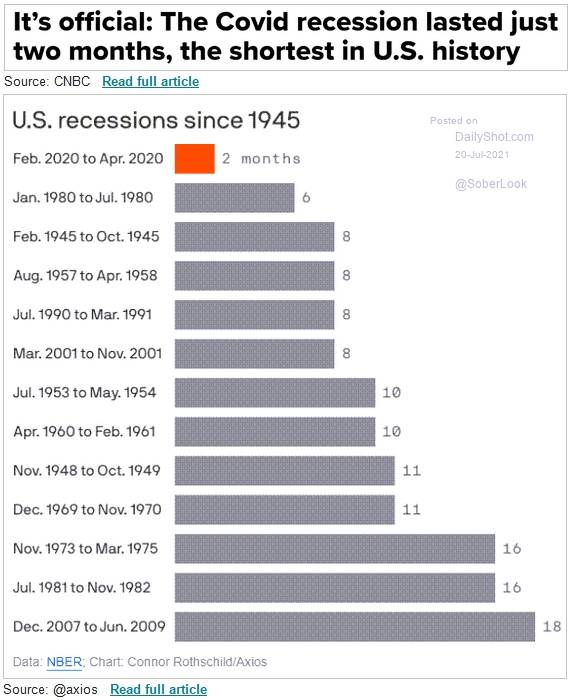 Del resto se guardate il grafico che segue qui sotto vediamo come il National Bureau of Economic Research USA ha conferito alla recessione di marzo aprile 2020 il titolo di più breve recessione di sempre e a quella del 2006 - 2009 quella di più lunga recessione di sempre. Noi potremo raccontare ai nostri nipoti di averle viste entrambe e questo sicuramente conferisce una carattere di grande instabilità psicologica a qualsiasi essere umano che voglia in una situazione come questa fare delle previsioni per il futuro.