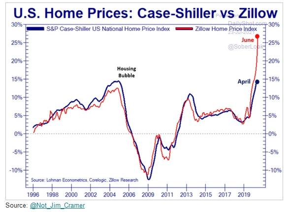 ll mercato immobiliare USA sta assumendo le sembianze di un mostro: stiamo ancora spettando i dati di giugno del Case Shiller index, forse l'indice sull'andamento del mercato immobiliare USA più famoso, ma quelli di aprile testimoniano che il boom è vicino come del resto il fratello povero del Case Shille ovvero l'indice Zillow che invece ha raggiunto livelli lunari.