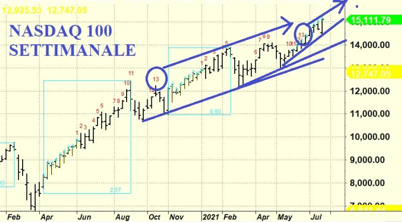 Potenza di un mercato che non ascolta ragioni. Se guardate il grafico qui sotto su scala settimanale del Nasdaq 100 potete osservare come il rialzo prima era sorretto da 2 trendline ma con il ritracciamento superato di qualche giorno fa siamo tornati alla bellezza di 3 trendline (breve medio e lungo periodo). Della serie che se prima presagivamo una congestione fino a settembre ora siamo costretti a far tornare indietro le parole e a prevedere rialzo e ancora rialzo e ancora rialzo.