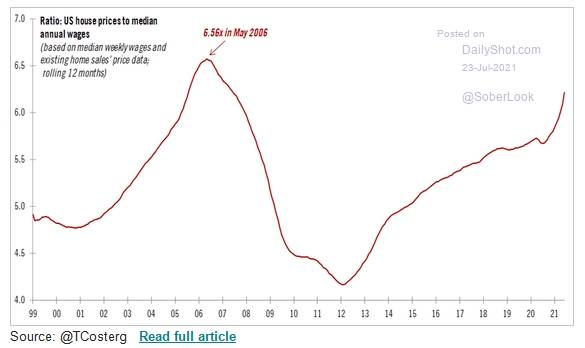 Se il Case Shiller e il Zillow sono indicatori di prezzo occorre però tenere in considerazione anche quello che è il carburante del rialzo dell'immobiliare: il reddito personale. Quindi un indicatore che io considero particolarmente indicativo è quello che fa il rapporto tra il prezzo medio di una casa (ora negli USA diciamo tra 250.000 e 350.000 dollari) e il reddito mediano da lavoro sempre gli USA. Qui sotto vediamo che in realtà se consideriamo questo indicatore dobbiamo ancora superare il massimo del maggio 2006 e quindi abbiamo ancora davanti spazio per correre. Questo significa che il +15% o il +25% che vediamo qui è là sull'incremento dei diversi prezzi dell'immobiliare USA, comunque li vogliate calcolare, nell'ultimo anno sono un dato che dovremo ancora rivedere al rialzo, che ci piaccia o no. C'è ancora combustibile da bruciare per pompare i prezzi dell'immobiliare e questo combustibile è proprio il rapporto che vedete qui sotto.