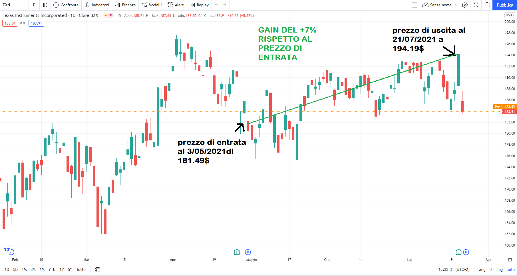 Come potete vedere siamo entrati nella candela del 3 maggio di quest’anno ad un prezzo di 181.49$ e siamo usciti nella candela del 21 luglio a 194.19$, guadagnando il +7% sul prezzo di entrata a mercato.
