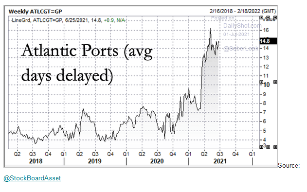 E i due settori che stanno esplodendo sono gli immobili negli USA e poi le azioni USA (e anche in Italia anche se per il momento in minor misura). E se volete ulteriore conferma eccovi il grafico dei ritardi nella consegna di merci nei porti occidentali degli USA per le navi che provengono dall’Atlantico: