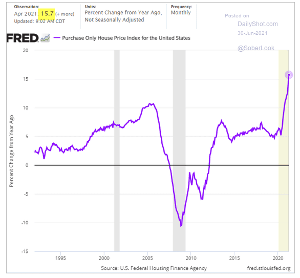 Ovviamente vale il detto che se gli USA starnutiscono noi prendiamo il raffreddore e questo vale quando le cose vanno male ma vale anche quando le cose vanno bene. Nello scorso editoriale avevo messo in luce come i prezzi degli immobili in Italia si siano mossi poco, come quelli delle azioni (+4% circa su base annua ad aprile / maggio) mentre negli USA come mostro con l’indice dei prezzi in acquisto delle case qui sotto sono letteralmente volati facendo impallidire il boom del 2006 con un +14% e passa aprile 2021 su aprile 2020: