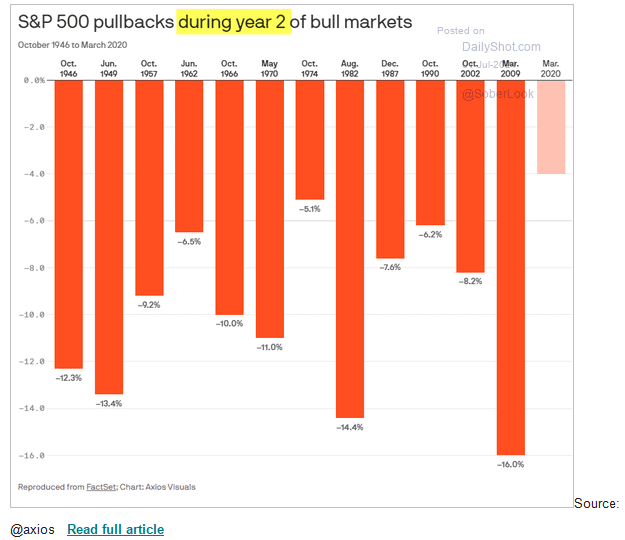La mia opinione è che davanti abbiamo un ritracciamento del 10-20% dei corsi azionari che non inficerà il rialzo di medio – lungo periodo che durerà ancora 1 o due anni. Quando ? Lo sapessi non lo scriverei sul giornale. Per questo prima di gridare “al lupo al lupo” è bene chiedersi quali sono stati i ritracciamenti nel corso degli ultimi rialzi. E di seguito una tabella che vi mostra le percentuali di ritracciamento prima che la tendenza sia proseguita (confermano quello che vi ho scritto io ovvero siamo dal 10 al 20% per stare larghi o meglio io ve lo ho scritto perché avevo letto la statistica):