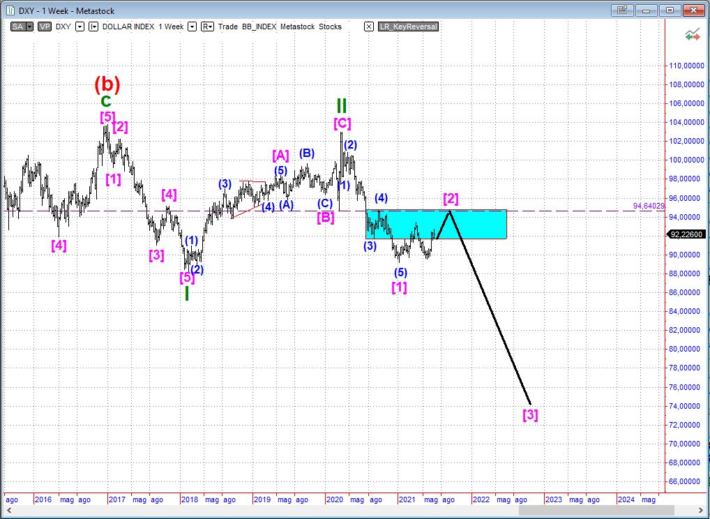 Il Dollaro prosegue la sua correzione in contro trend che dovrebbe esaurirsi nello specchio dell’onda (4). (onda quarta di grado inferiore). L’Euro dal canto suo dovrebbe scendere all’incirca in eguale misura.