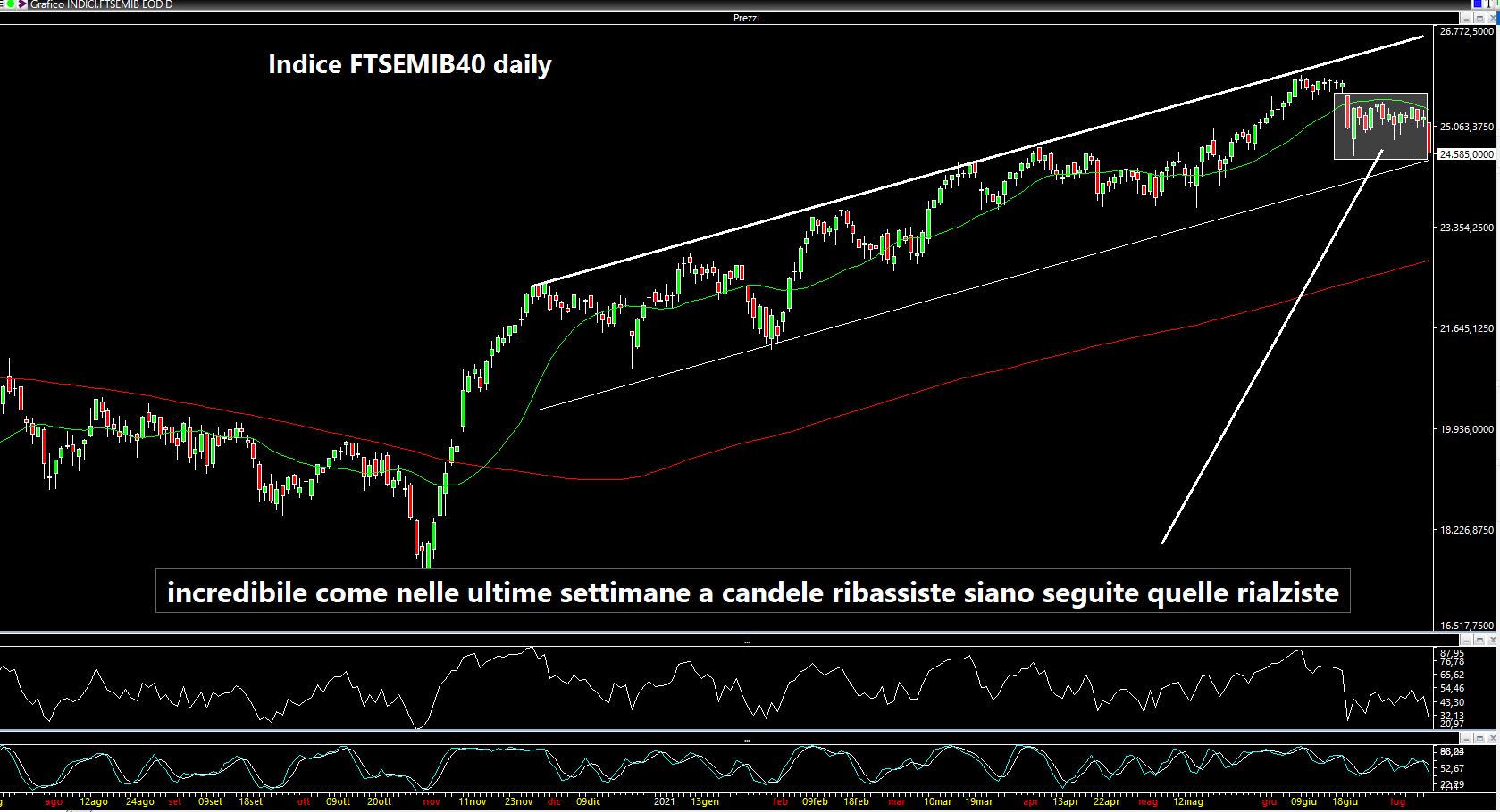 Questa mattina ho analizzato le barre daily sul nostro indice FTSEMIB40: una consecutio di candele verdi e rosse per quasi tre settimane, situazione estenuante per un operatore. E se oggi siamo scesi forse domani si risalirà, tanto più che abbiamo testato nel pomeriggio una trendline dinamica a salire. Sarà importante in caso di rimbalzo non scendere sotto i minimi odierni nella prossima ottava.