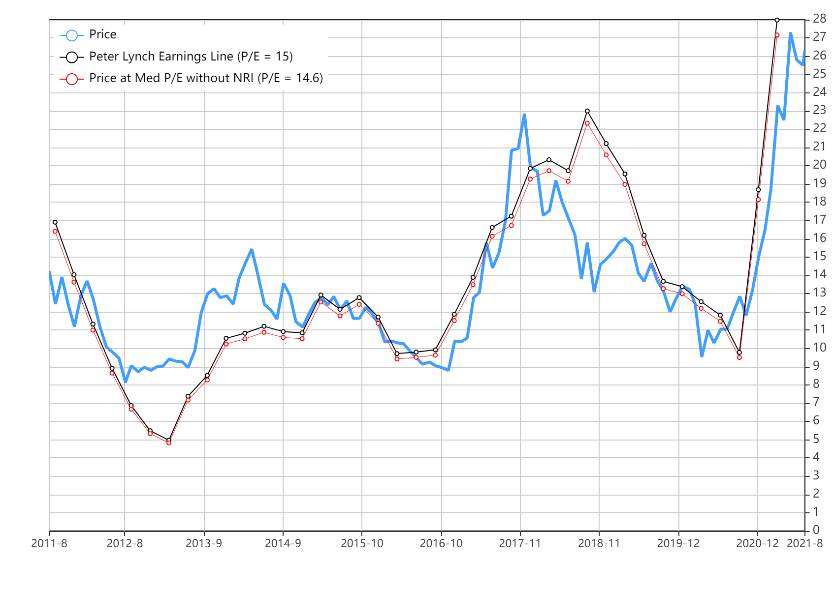 Come anticipato, però, la cosa interessante è che il prezzo del titolo si è sempre tenuto relativamente vicino alla earnings line, rimanendo quindi sempre ben ancorato ai fondamentali della società.