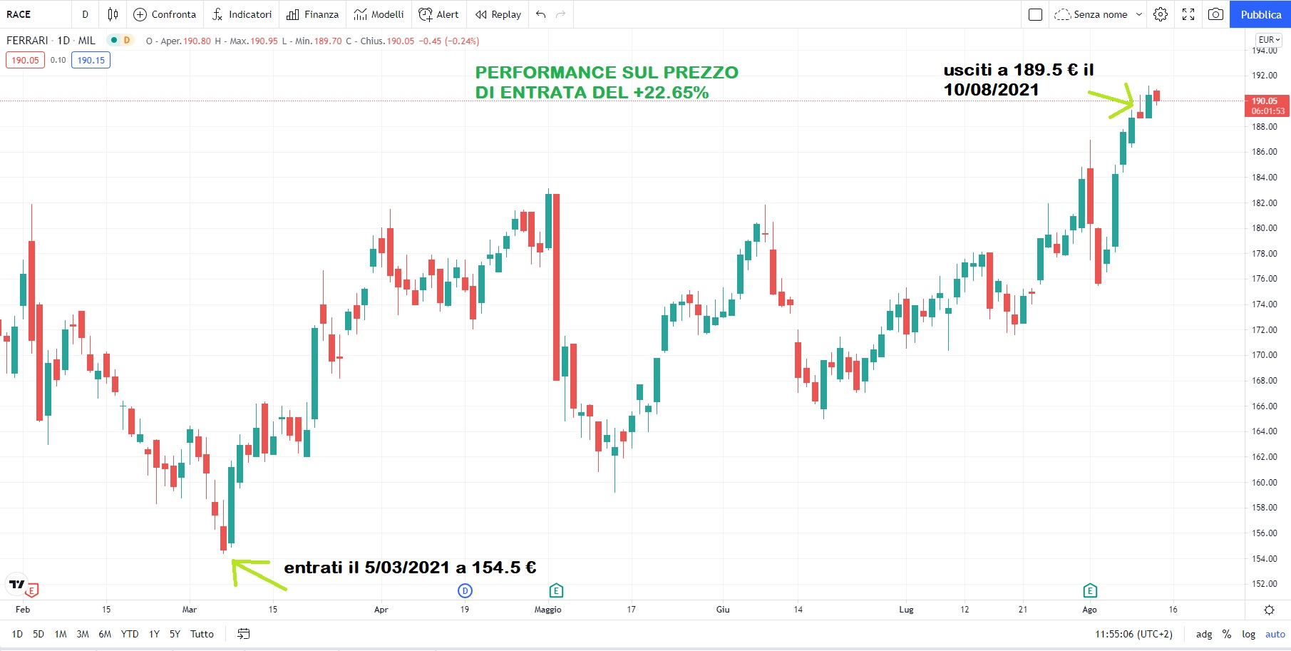 Ferrari S.p.a spinge sull’acceleratore in Borsa e nella giornata di martedì 10 agosto ci ha fatto raggiungere il target con un gain del +22.65%.