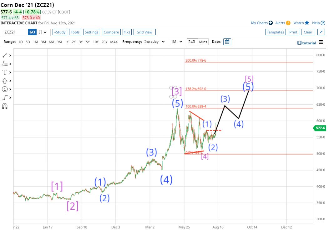 Con un andamento più o meno come gia suggerito sui precedenti report. l'ultimo cinque onde rialzista dovrebbe portare il Mais nellafascia dei 690$.