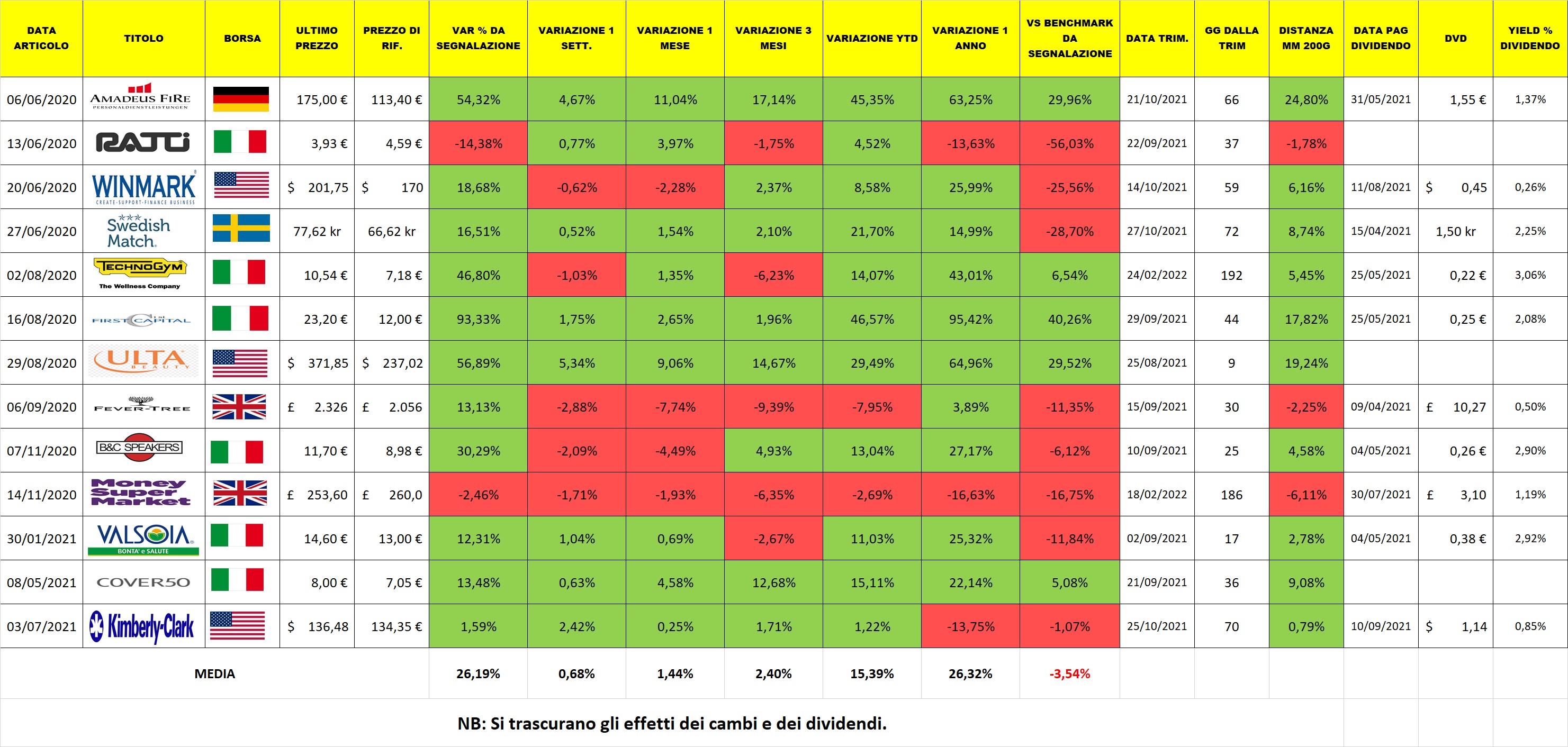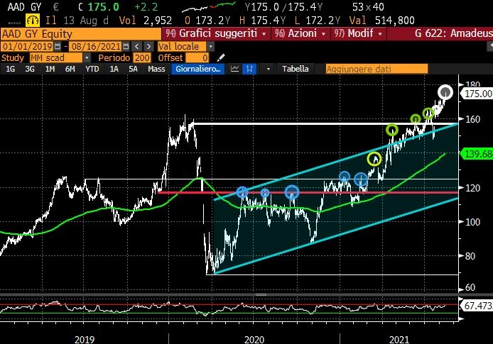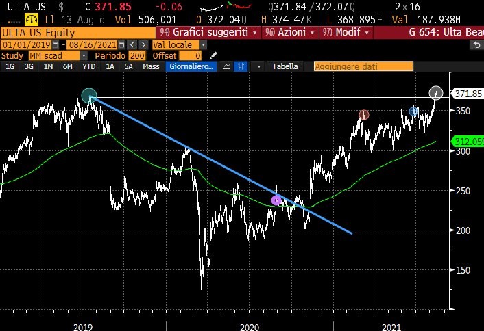 Prosegue l’ottimo andamento AMADEUS FIRE (+54,32%) accompagnato da ULTA BEAUTY (+56,89%): entrambi i titoli si trovano in prossimità dei massimi storici (vedi grafici sotto).