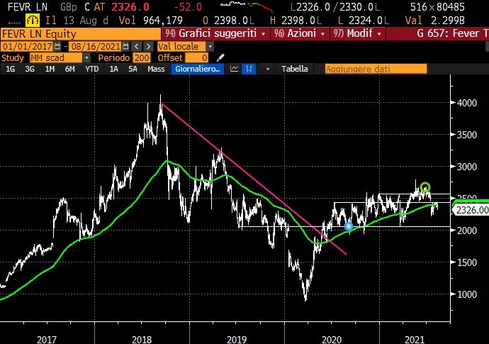FEVER TREE, dopo aver rotto a rialzo la resistenza situata in prossimità di 2.500, ha ripiegato tornando a testare la media mobile a 200 giorni (linea verde).