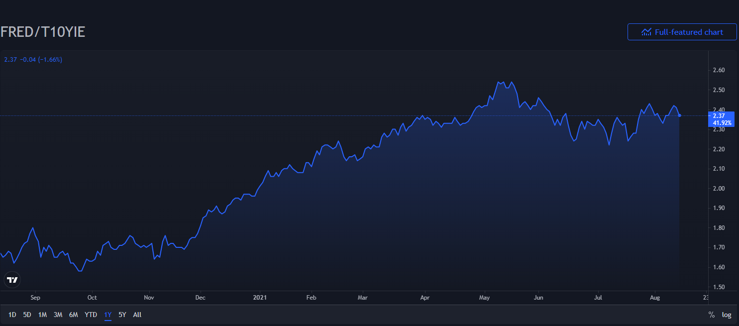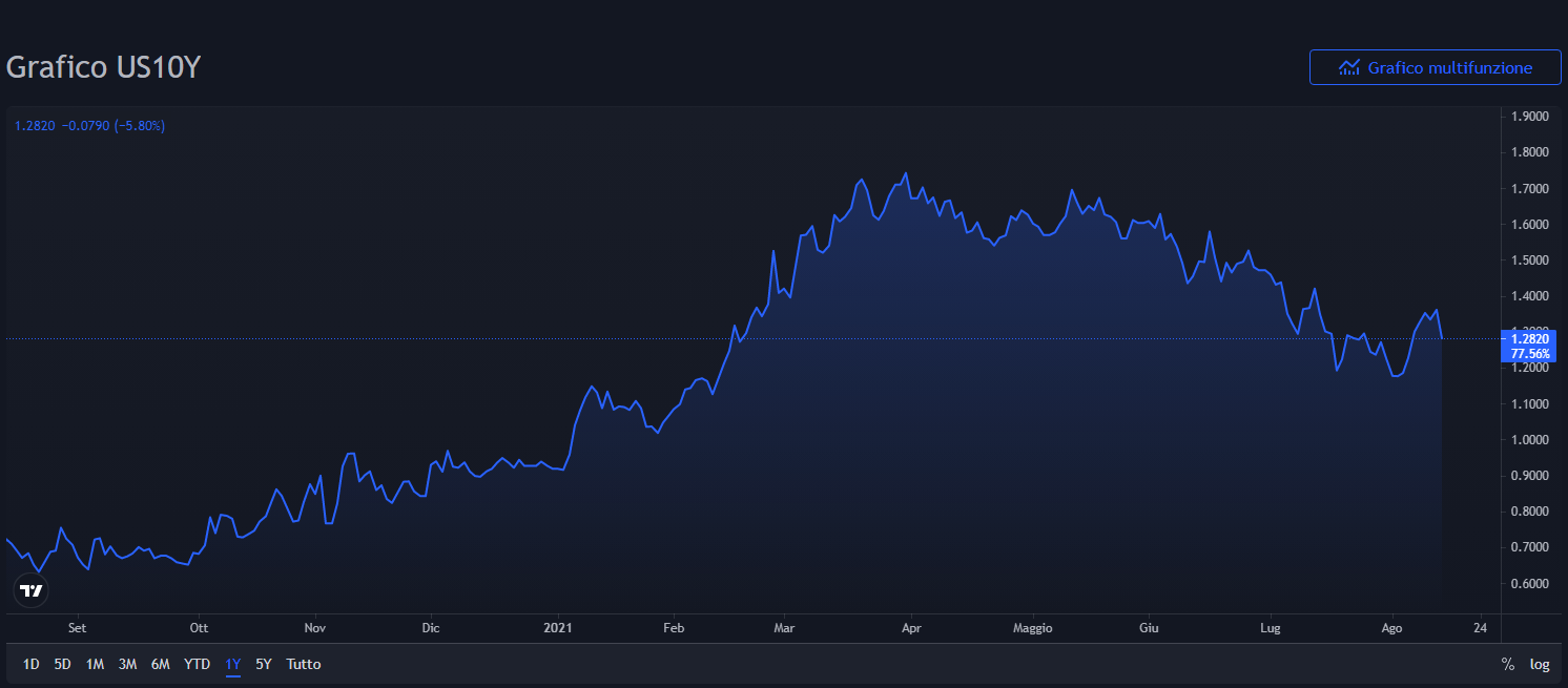 I rendimenti USA in balia dei dati macro. A metà settimana, dopo l’uscita dei dati sul CPI di luglio, il rendimento del Treasury 10Y fa registrare un massimo a 1.378%, cosa che non si vedeva da un mese esatto, per poi iniziare scendere repentinamente dopo il deludente e sorprendente calo della fiducia dei consumatori, fino ad un minimo di 1,282% che poi rappresenta anche il valore della chiusura settimanale. Anche i breakeven inflation dopo aver fatto registrare un massimo a 2,42%, venerdì dopo il dato macro si sono riportati al 2,37% esattamente come nel fine settimana scorso (v. grafici):