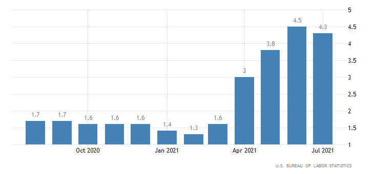 Il dato mensile dell’indice dei prezzi al consumo “core” che non tiene conto del settore del cibo e dell’energia a luglio rallenta segnando una crescita dello 0,3%; appena sotto il consensus (0,4%) ma ben al di sotto rispetto a quello di giugno (+0,9%). Il dato annualizzato, come previsto dal consensus, a luglio si attesta a 4,3%, con una leggera decelerazione rispetto al +4,5% di giugno. I prezzi delle auto usate, che sono aumentati rapidamente tra aprile e giugno, hanno guadagnato solo lo 0,2% a luglio, dopo un aumento di oltre il 10% nel mese precedente. I due dati sono rilasciati dall’U.S. Bureau of Labor Statistics.