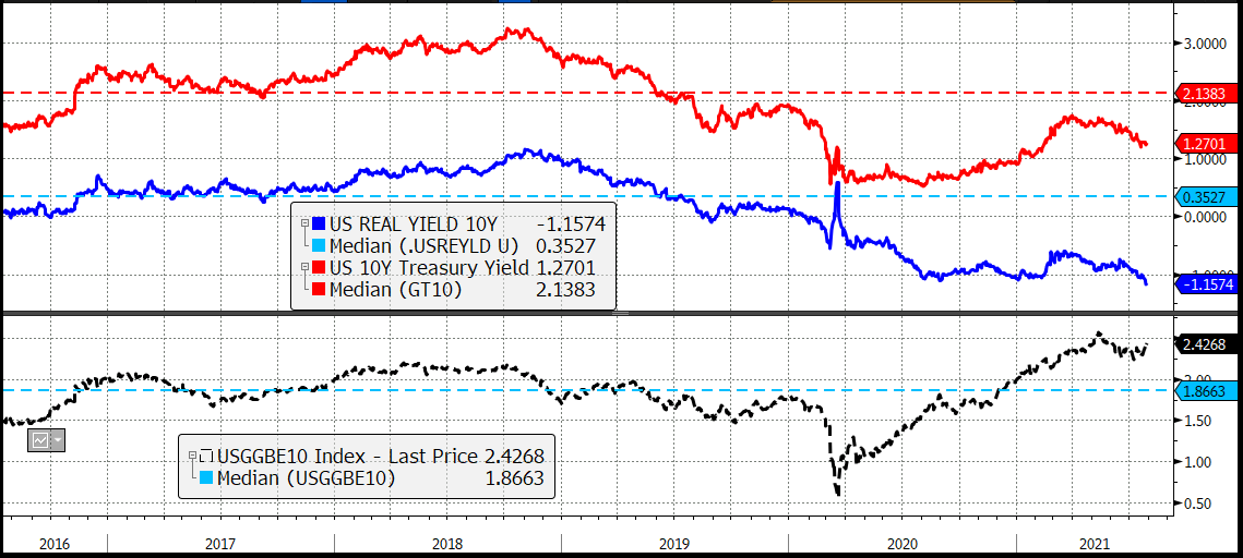 La peculiarità del mercato dei tassi è che il ritorno del risk appetite ha ridato un po' di vigore ai breakeven inflation. Così, il calo dei rendimenti si riflette una volta di più sui tassi reali, che sono crollati a -1.15%, ovvero sotto i livelli toccati durante la pandemia. L'indicazione fondamentale di questa discesa è quasi incredibile, visto che i tassi reali dovrebbero in teoria riflettere la crescita di medio periodo. Certo che tassi reali così bassi, intesi come rendimenti nominali molto inferiori alle attese di inflazione, non sono certo attraenti da comprare come investimento.