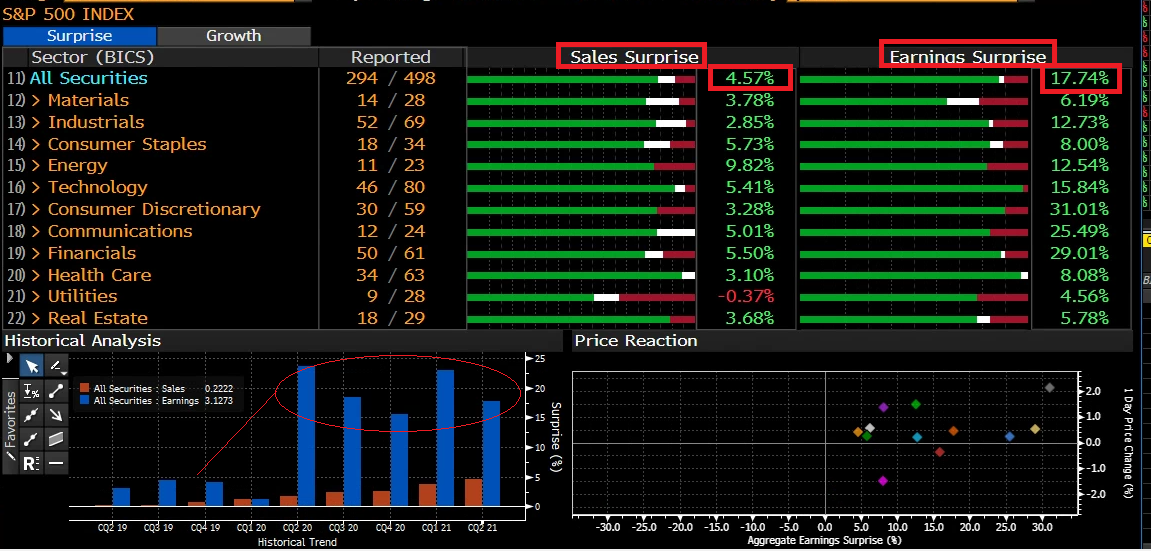 Ma come mai gli indici hanno solo limato i precedenti record e non sono avanzati come da risultanze più che buone delle trimestrali economiche societarie ? Per la cronaca ALPHABET ha stracciato le stime, ma la reazione è stata appena discreta; MICROSOFT anche, ma l'accoglienza è stata tiepida per la delusione del business cloud; APPLE le ha spappolate, ma anche qui mood freddino, a causa delle previsioni per i prossimi trimestri; mentre ribassi sostenuti per FACEBOOK con previsioni per i prossimi due trimestri in calo; ed AMAZON che ha ceduto nel fine settimana sempre a causa delle previsioni per i prossimi trimestri in arretramento dopo aver distribuito utili in netto aumento anche se con ricavi in leggera diminuzione. In sostanza 4/5 “earnings” parecchio sopra le attese non hanno prodotto le consuete accelerazioni ed anzi quelle in linea, o di poco sotto, hanno preso sonore batoste (v. anche PayPal, Citrix, ecc.). Da ciò si evince che il mercato, oltre ad aver già scontato i buoni dati economici, si è spinto oltre, sopravvalutando per eccesso di euforia le quotazioni delle società. La stagione delle trimestrali economiche è abbastanza avanti con 294 aziende su 500 dell’indice S&P a aver riportato i propri dati e le risultanze mostrano che la sorpresa media è roboante, con un +17% abbondante sui dividendi (+4.5% il fatturato). Però la sorpresa è tale solo a metà in quanto, come osservato nei precedenti articoli, questo è il quinto trimestre che va avanti questa musica (vedi istogramma in basso), ecco il motivo per il quale le prese di beneficio post “earnings” si intensificano. Quindi, a breve, dovrebbe vedersi una fase di consolidamento con prese di beneficio un po' più convinte (il che non sarebbe un male, anzi !).