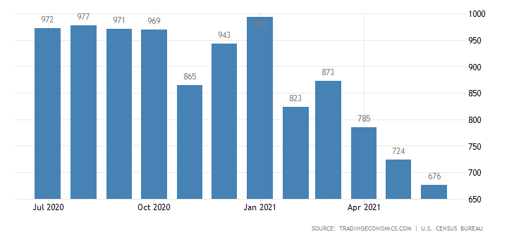 Il dato sulla vendita di nuove case nel mese di giugno scende del 6,6%. Si tratta del terzo mese in calo, nello specifico da maggio a giugno si è passati da 724 mila a 676 mila; il consensus prevedeva una crescita a 800 mila. Il dato è rilasciato dall’U.S. Census Bureau.