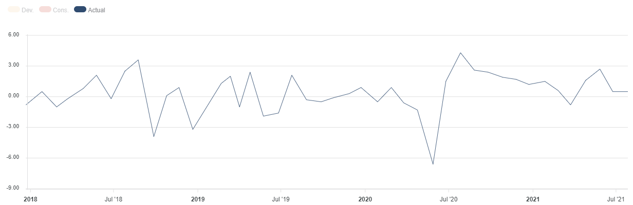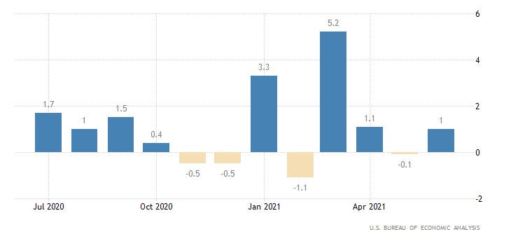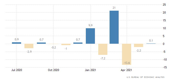 In settimana l’U.S. Bureau of Economic Analysis ha pubblicato il dato preliminare relativo al prodotto interno lordo del secondo trimestre. Dato che segna una crescita del 6,5%, appena sopra il 6,3% del primo trimestre (rivisto da 6,4%), ma decisamente sotto il consensus di 8,5%. Il dettaglio però è più confortante: i consumi sono molto forti, mentre i contributi negativi vengono dalle scorte (-1.1%), dal canale estero (-0.4%) e dalla spesa pubblica (-0.4%). Male però l'investimento in immobiliare.