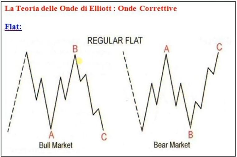 Una correzione Flat è caratterizzata da tre onde (A, B e C) dove l’onda A, differentemente da quanto accade nei zigzag sviluppa solo tre movimenti come l’onda B, al posto di cinque. L’onda C invece sviluppa sempre cinque movimenti. Per questo motivo i modelli Flat vengono chiamati anche modelli 3-3-5.