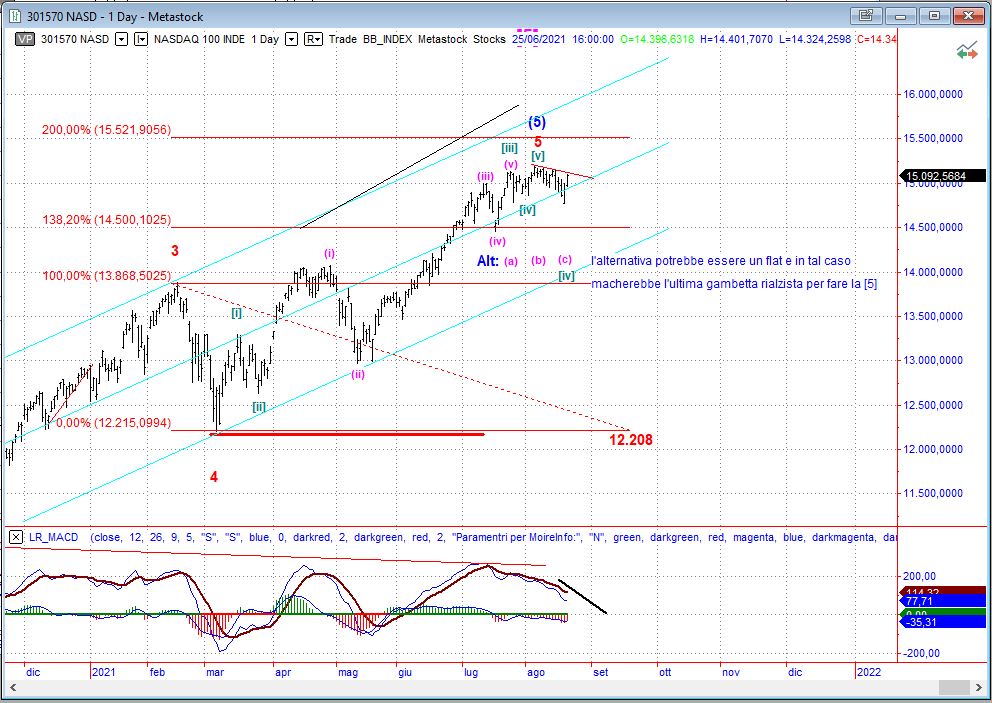 Come si vede dal grafico ormai, ammesso che debba ancora fare l’ultima gambetta di rialzo, siamo veramente a ridosso di quel target di 35.805 punti che vado indicando da molti mesi. Se poi l’onda (5) fosse già conclusa sull’ultimo massimo (quello del 16 agosto) allora una rottura al ribasso dell’ending diagonal che ha caratterizzato l’onda [v] darebbe inizio ad un calo molto ripido (di solito queste onde diventano autentiche rasoiate). Naturalmente questo è quanto si può evincere dal quadro tecnico teorico, dopodichè la conferma o la smentita alle nostre considerazioni come sempre dovrà darle il mercato.