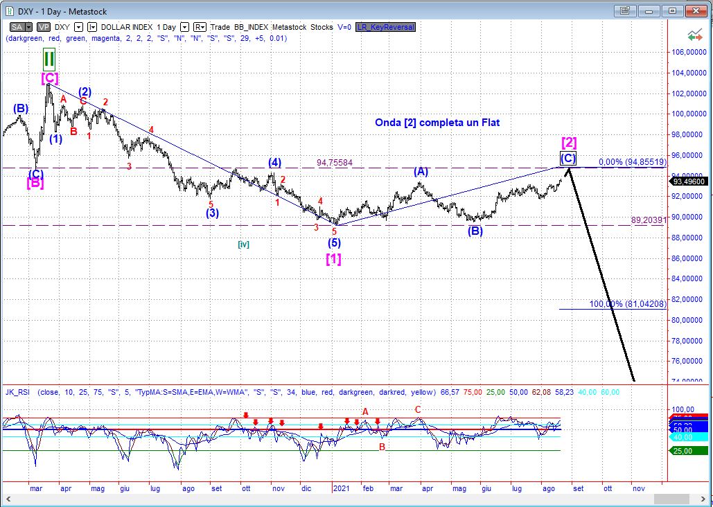 L’onda [2] di grado primario sul Dollar Index è ormai al capolinea e determina un movimento in contro trend caratterizzato da una configurazione flat. La successiva onda [3] dovrebbe determinare presto dei prezzi ben più bassi del minimo di gennaio.