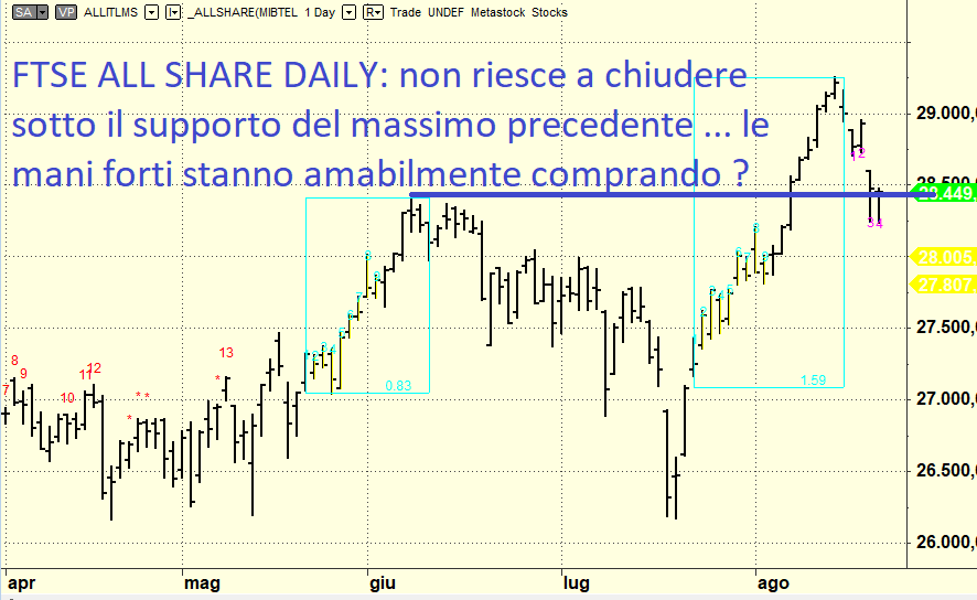 Il nostro indice Ftse All Share nelle ultime due sedute di Borsa dell’ottava appena terminata non è nemmeno riuscito a chiudere al di sotto del massimo relativo precedente che finora aveva fatto da tappo (resistenza) e ora funge da pilastro del rialzo (supporto). Segno che se tanto ci dà tanto vedremo la settimana prossima una ripartenza con il turbo.