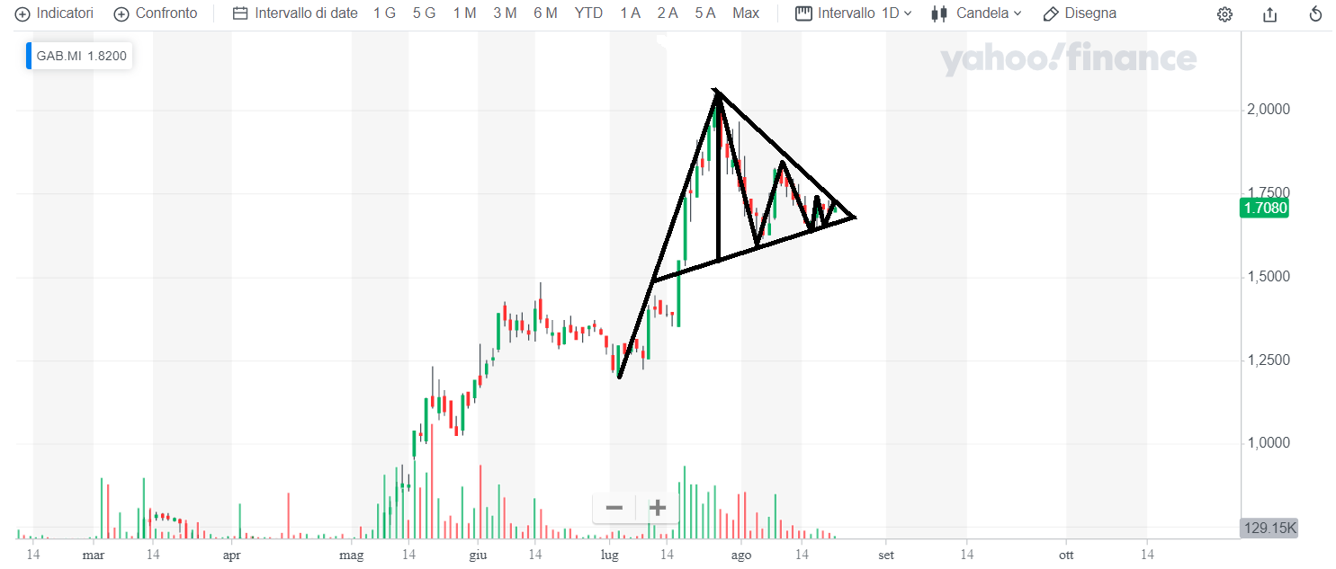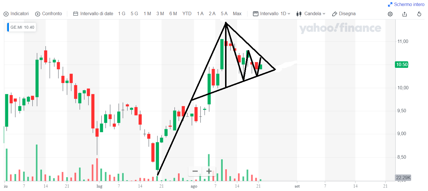 Altro titolo, altro triangolo simmetrico. Questa volta si tratta dell’impostazione grafica di Gefran che presenta due massimi decrescenti e due minimi crescenti. I due massimi sono 11,40 (11 agosto) e 10,80 (18 agosto); i due minimi, invece, sono 10,15 (17 agosto) e 10,25 (20 agosto). Come nel caso precedente da guardare con attenzione la direzione della rottura del triangolo.