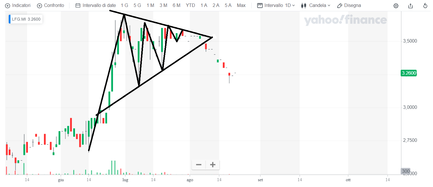 Nel caso di Leone Film Group, invece, il triangolo simmetrico individuato nell’articolo dell’11 agosto è stato rotto nel lato basso. Il triangolo simmetrico che avevamo indicato era formato dai tre massimi discendenti del 30 giugno (quotazione 3,7000), del 9 luglio (3,6400) e del 21 luglio (3,6200) e dai due minimi crescenti del 7 luglio (3,1600) e del 19 luglio (3,2800). In realtà già dalla data della pubblicazione era cominciato un movimento verso il basso.