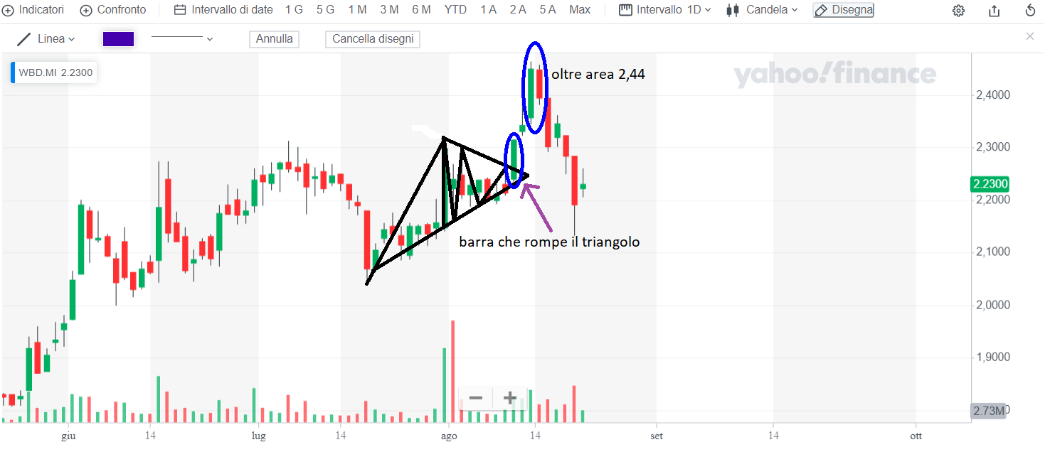 Per Webuild avevamo segnalato un triangolo simmetrico con tre massimi decrescenti (il primo, il 30 luglio a 2,3180, il secondo il 3 agosto a 2,2980, il terzo il 10 agosto a 2,2640) e due minimi crescenti (il 2 agosto a 2,1600, il 4/5 agosto a 2,1860). Il triangolo in questione è stato rotto proprio il giorno della pubblicazione dell’articolo nel quale analizzavamo la situazione grafica di Webuild; l’11 agosto, infatti, il titolo ha fatto segnare un massimo di 2,3140. Sempre nell’articolo dell’11 agosto, avevamo detto che “in caso di rottura dell’ultimo massimo il target potrebbe essere posizionato intorno ad area 2,44”. Area che è stata raggiunta ed anche superata nelle sedute del 13 e del 16 agosto, quando sono stati registrati rispettivamente massimi di 2,4640 e di 2,4580.