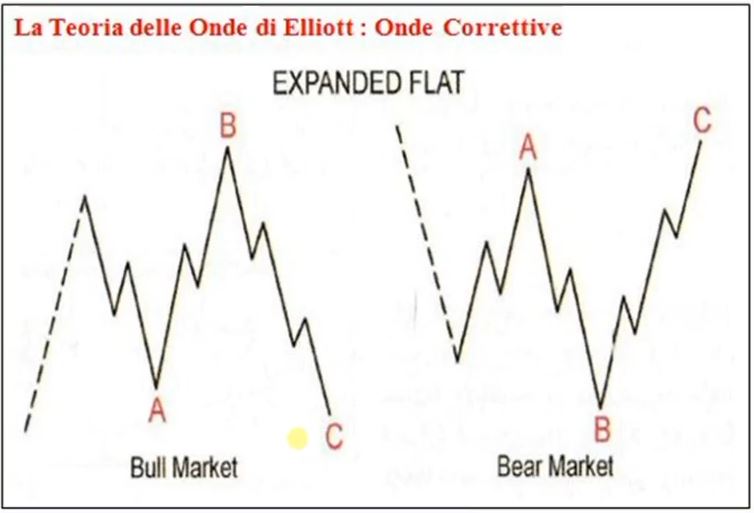 Parliamo sempre di un modello 3-3-5, ovvero 3 movimenti per l’onda A, 3 per l’onda B, e 5 per l’onda C. La differenza rispetto al Flat regolare sta in un onda B il cui ritracciamento supera l’origine di onda A.