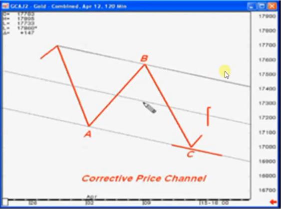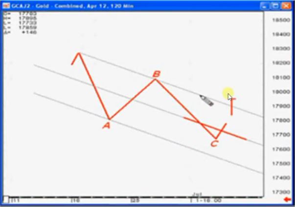 La figura sopra mostra la costruzione di un canale correttivo su zigzag o flat regolari (se siamo su un flat regolare il canale non avrà pendenza e sarà pressochè orizzontale). Se l’onda C non dovesse scendere fino al bordo inferiore del canale si sceglierà come punto di ingresso una chiusura che esca dal canale anziché una chiusura che supera la mediana, come vediamo nel grafico successivo.