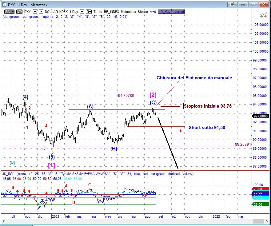 Il Dollar Index ha terminato un Flat ribassista ed ora dovrebbe scendere con un onda [3] potenzialmente devastante. Naturalmente prima di incrementare la posizione short attenderemo la rottura del livello critico a 91,50 e useremo il massimo di onda (C) come stoploss iniziale.