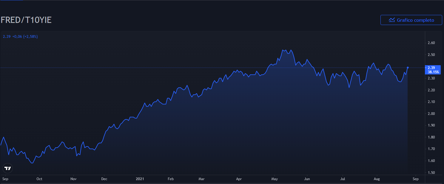 Passiamo ora a dare uno sguardo ai rendimenti USA. Possiamo affermare che la settimana è passata abbastanza tranquillamente nonostante l’uscita di alcuni dati macro importanti ma, soprattutto, dalle dichiarazioni di Powell a margine del simposio di Jackson Hole. Il picco raggiunto nella giornata di giovedì scorso a 1,35% è stato riassorbito a 1,31% il giorno successivo quando ci si è resi conto che il FOMC non aveva rilasciato alcuna data certa circa l’inizio del “tapering”. Mentre si alza il tasso di breakeven inflation (tasso di inflazione implicito nelle quotazioni di un titolo indicizzato che permette al rendimento a scadenza del titolo di uguagliare quella di un bond a cedola fissa di analoga vita residua), che dal 2,27% di due venerdì fa si è riportato al 2,39% nel fine settimana scorso (v. grafici):