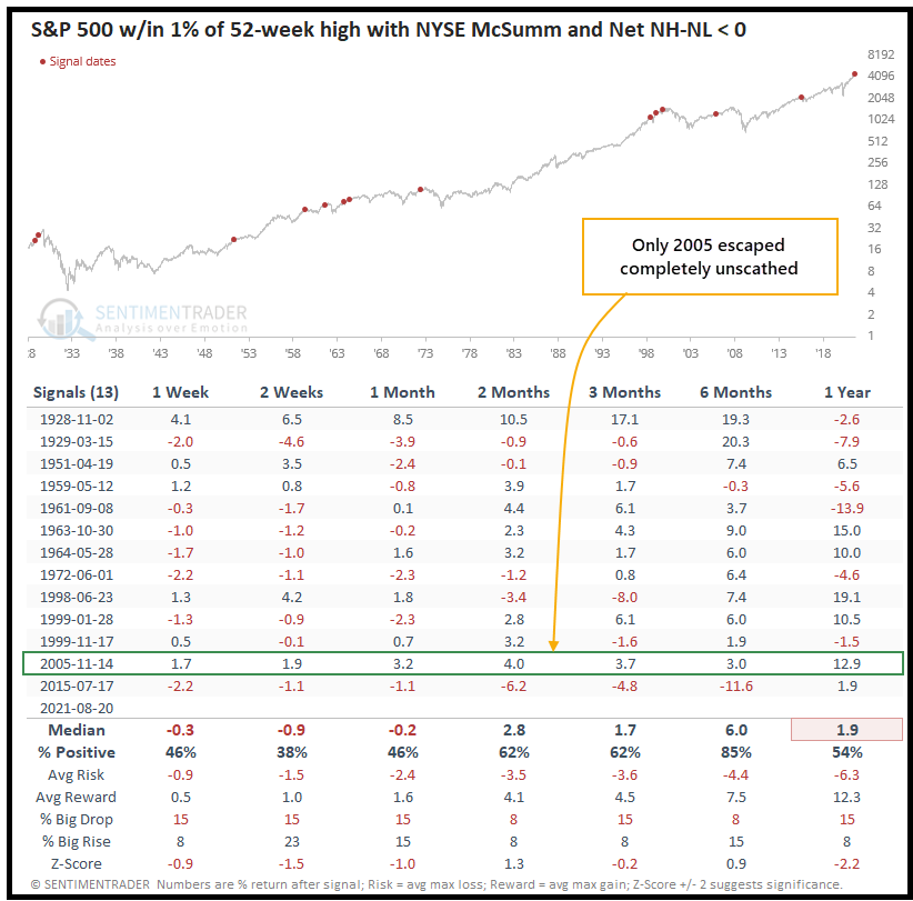 Sentimentrader.com ha notato i giorni scorsi come i recenti massimi siano avvenuto con 2 indicatori di Breadth del NYSE (MC Clellan Summation index e percentuale netta di nuovi massimi meno nuovi minimi a 52 settimane) in territorio negativo, una configurazione piuttosto rara. Il backtest di questo segnale mostra che i ritorni dopo questo segnale sono in media molto peggiori del solito e che solo un anno non ha visto l'indice tornare sotto i livelli si quando il segnale è scattato, nel corso dei 12 mesi successivi.