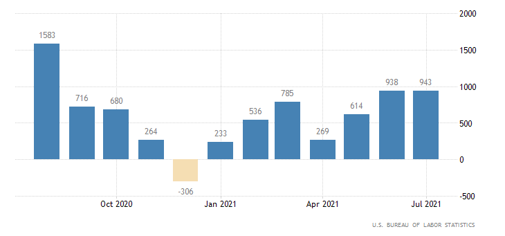 I nuovi occupati del mese di luglio sono usciti ben sopra le attese, anche se non raggiungono la soglia psicologica del milione. Ma le revisioni dei mesi di maggio e giugno portano in dote altri 119.000 occupati in più. Passando ai numeri, sono stati creati 943 mila nuovi posti di lavoro non-agricoli. Dato superiore a quello di giugno (938 mila, rivisto da 850 mila) e ben superiore al consensus, che prevedeva un calo a 870 mila. Nel settore privato i nuovi posti di lavoro creati nel mese di luglio sono 703 mila (praticamente pari al consensus di 700 mila), meno rispetto ai 769 mila di giugno (dato rivisto da 662 mila). I dati sono rilasciati dall’U.S. Bureau of Labor Statistics.