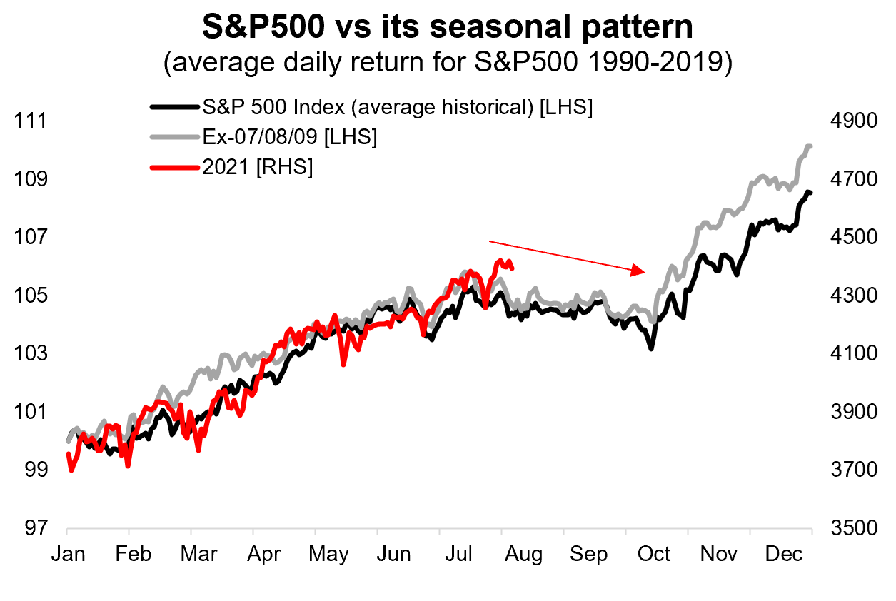 Va rilevato che la stagionalità per l'azionario non è il massimo. Normalmente in Agosto l'S&P si prende una pausa, e il Vix (la volatilità implicita, che normalmente è correlata con la realizzata) sale.
