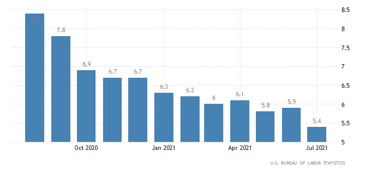 Tasso di disoccupazione in calo. In giugno il dato era pari a 5,9%, in luglio è sceso a 5,4%; sotto il consensus del 5,7%. Il dato è elaborato dall’U.S. Bureau of Labor Statistics.
