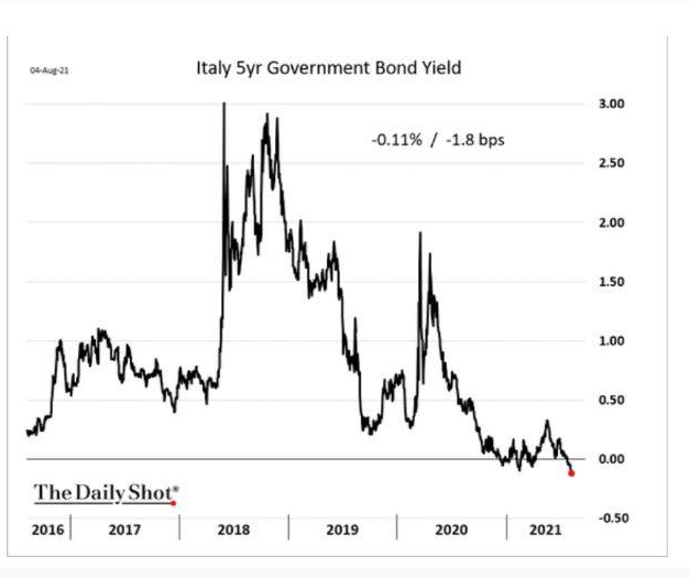 Ma veniamo ai duri dati “fondamentali”: pubblico di seguito i tassi di rendimento a 5 anni delle obbligazioni di Stato italiane che ormai hanno infranto i minimi di sempre a monito di quegli sconsiderati che non hanno ancora capito che debbono comprare azioni o immobili: