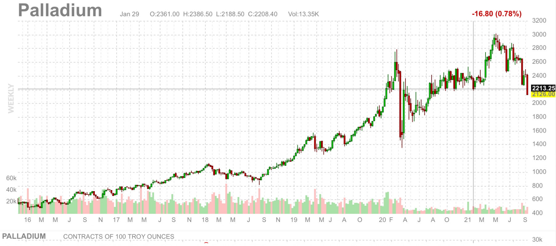Nel corso del mese di agosto sono tornati gli acquisti sui metalli preziosi, ad eccezione del Platino (laterale) e del Palladio (ribassista, cfr. grafico future). Al di là delle oscillazioni di breve/medio periodo, il comparto rimane importante in ottica strategica. Come strumenti manteniamo quindi in portafoglio i seguenti Etc quotati su Borsa italiana: Oro, ticker PHAU: PC 143,54; Argento, ticker PHAG: PC 18,908; Platino, ticker PHPT: PC 76,930. A parziale “copertura” della posizione lunga netta sul comparto manteniamo anche lo short sul Palladio (ticker 1PAS: PC 10,556).